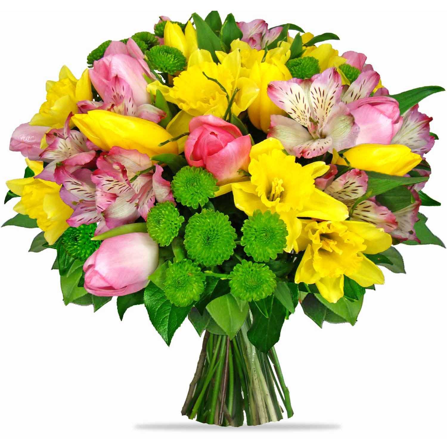 | Standardní | 7 ks narcis, 5 ks tulipán, 2 ks chrysanthéma santini, 1 ks alstromerie a dekorativní zeleň (pistacie, salal) |
