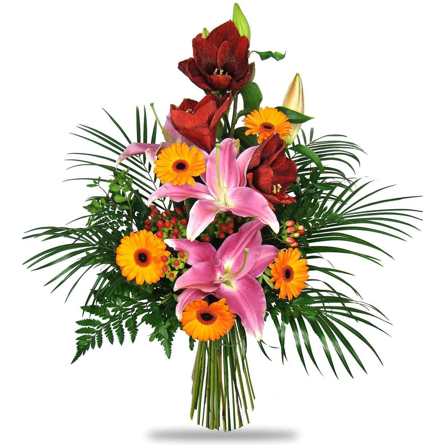 Exkluzivní 3 ks amarylis, 3 ks královská lilie, 6 ks hypericum, 9 ks germínka a dekorativní zeleň (pistacie, robelini, rumora)
