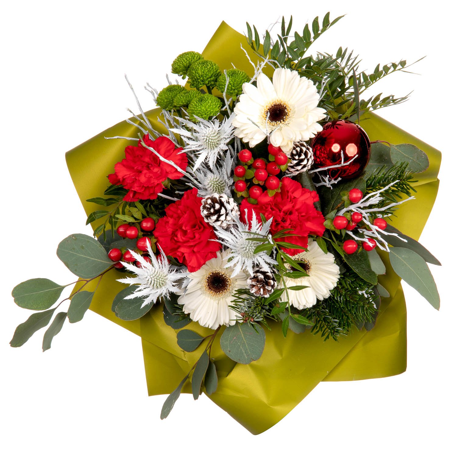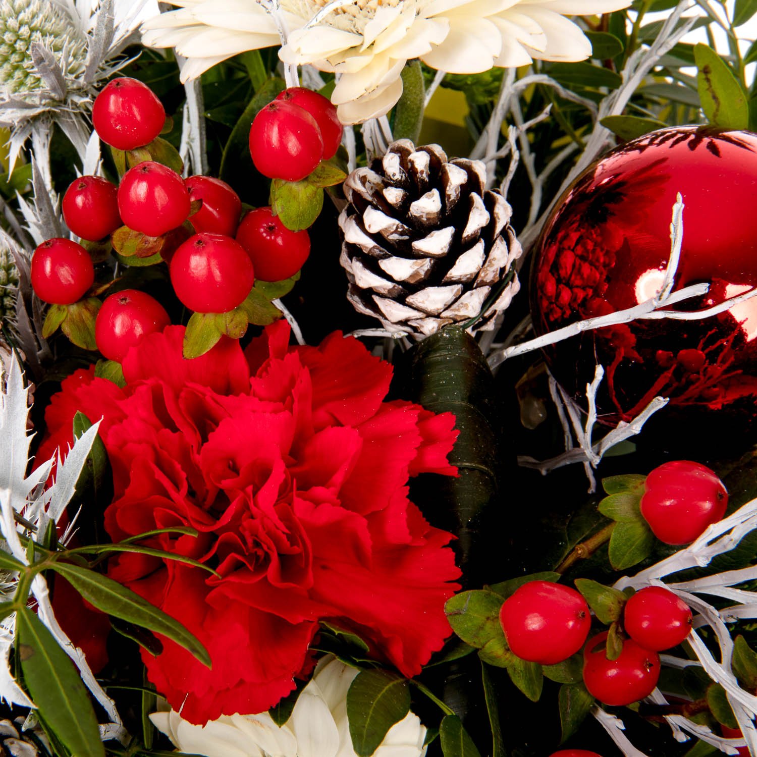 3 ks karafiát, 3 ks gerbera mini, 1 ks chrysantéma santini, 1 ks eryngium, 3 ks hypericum, manžeta, vánoční dekorace a dekorativní zeleň