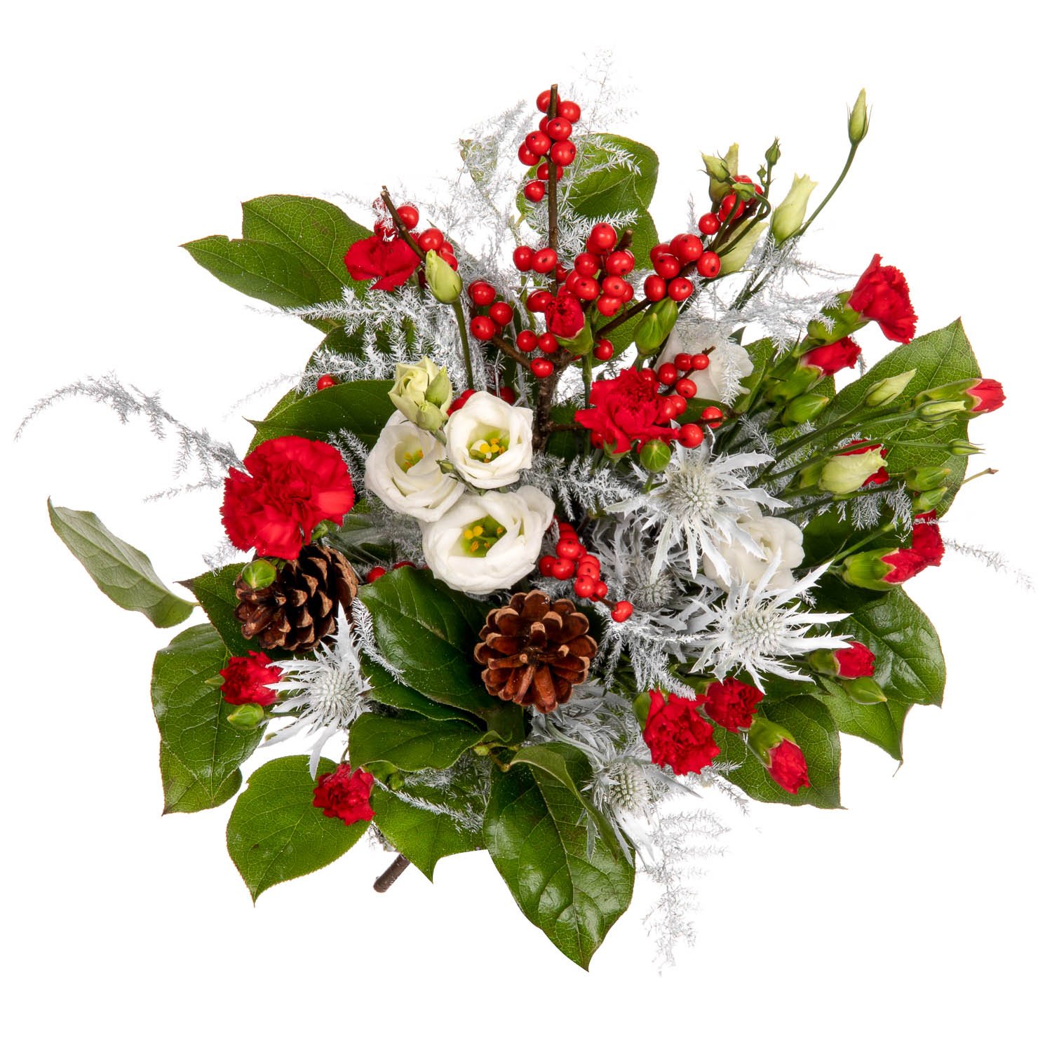 1 ks ilex, 2 ks eustoma, 3 ks trsový karafiát, 2 ks eryngium, vánoční dekorace a dekorativní zeleň