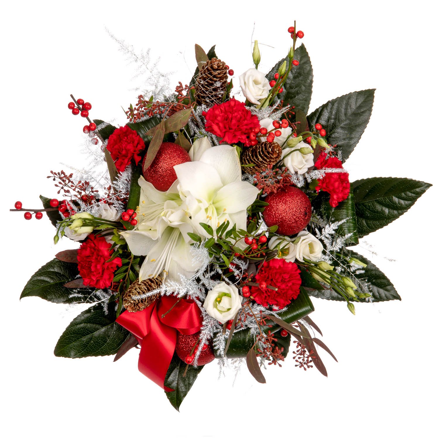 1 ks amarylis, 3 ks ilex, 5 ks karafiát, 3 ks eustoma, mašle, vánoční dekorace a dekorativní zeleň