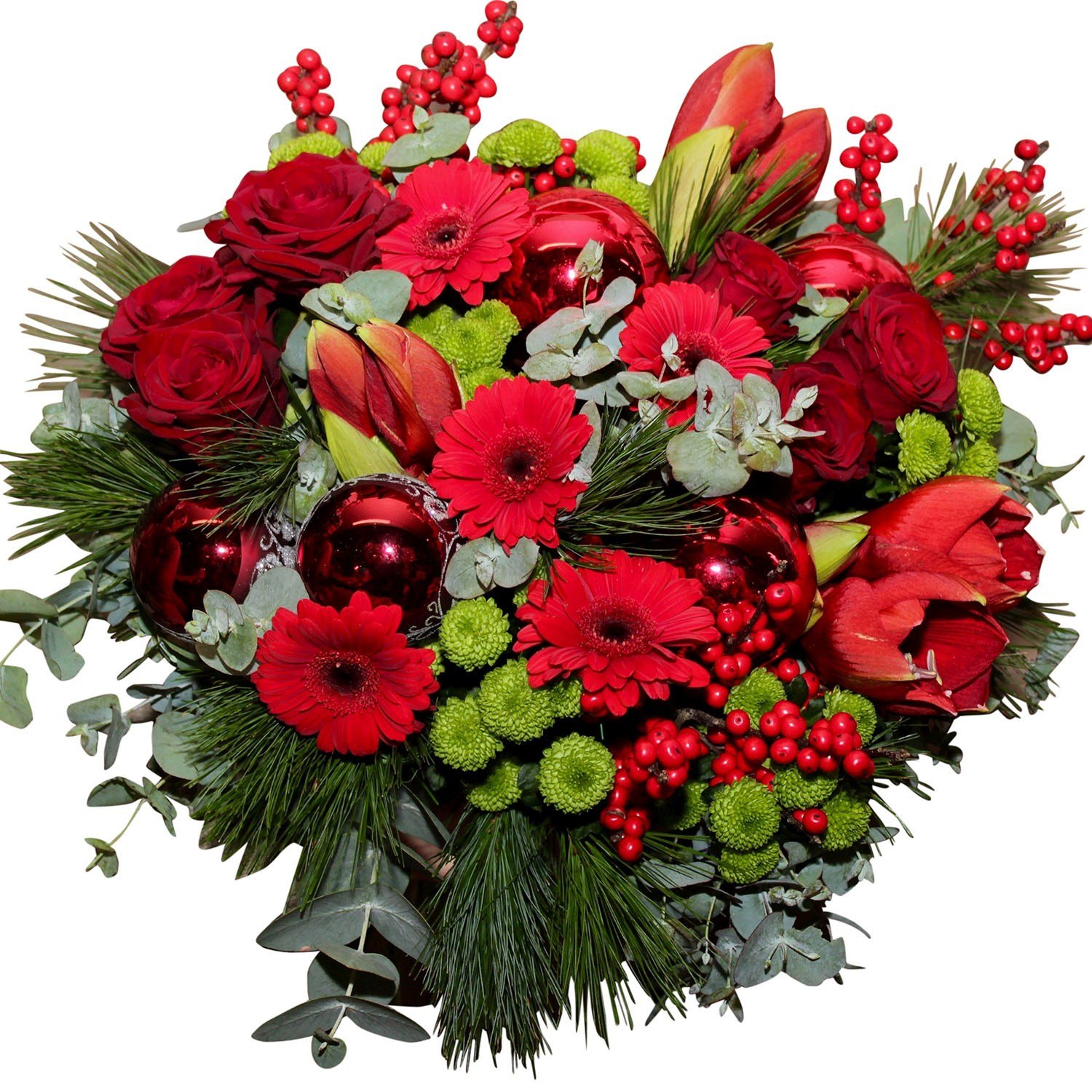 7 ks červené růže, 5 ks červená gerbera mini, 3 ks červený amarylis, 4 ks červený ilex, 6 ks santini, vánoční dekorace, vánoční zeleň (borovice) a dekorativní zeleň (eukalyptus)
