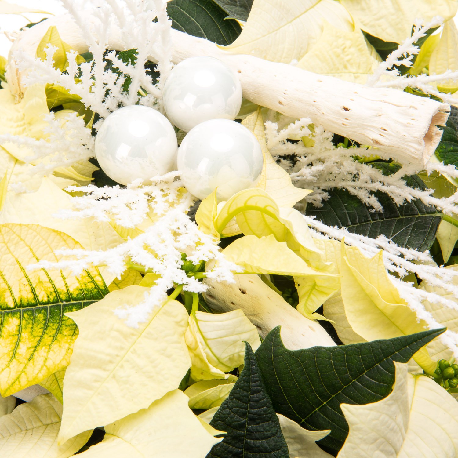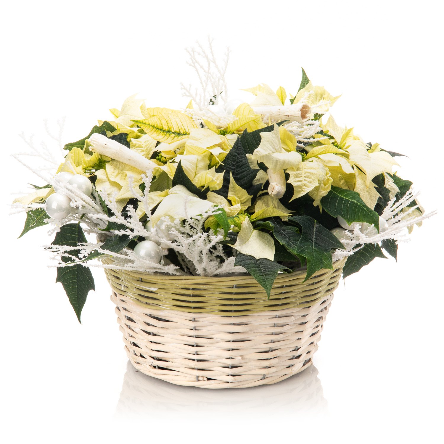 3 ks bílá vánoční hvězda, vánoční dekorace, proutěný koš a dekorativní mašle