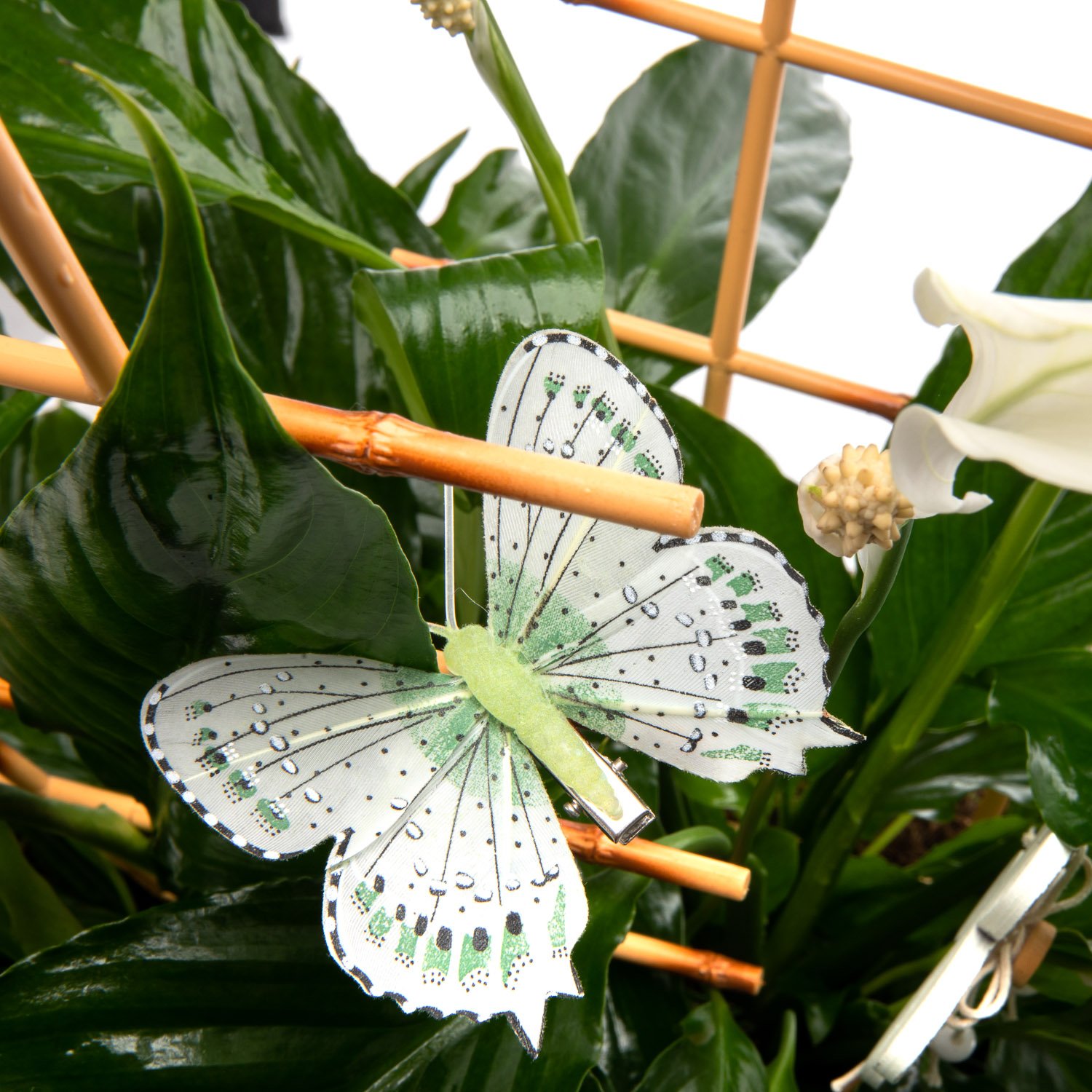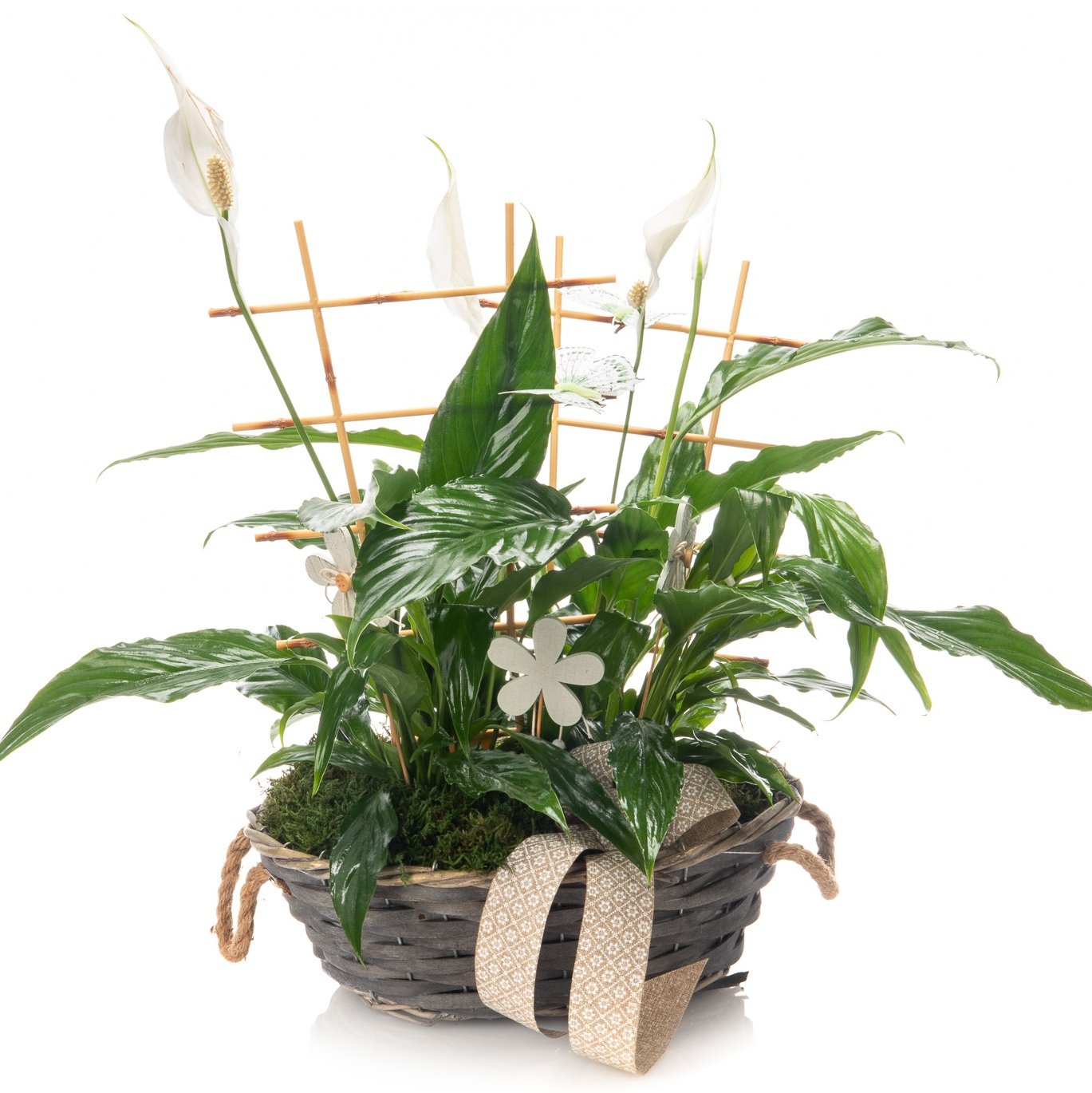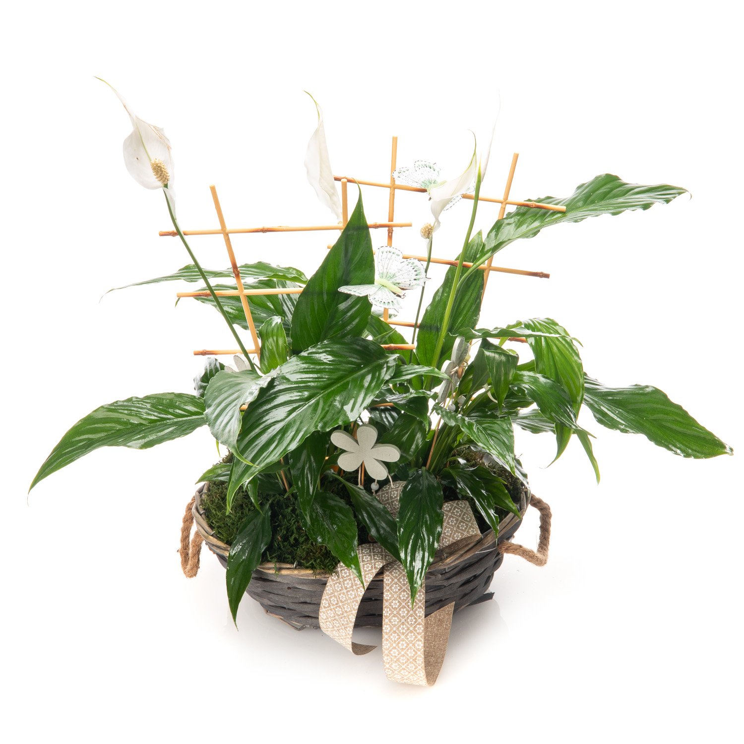 2 ks spathiphyllum (lopatkovec), sezónní dekorace, okrasná mašle a proutěný koš