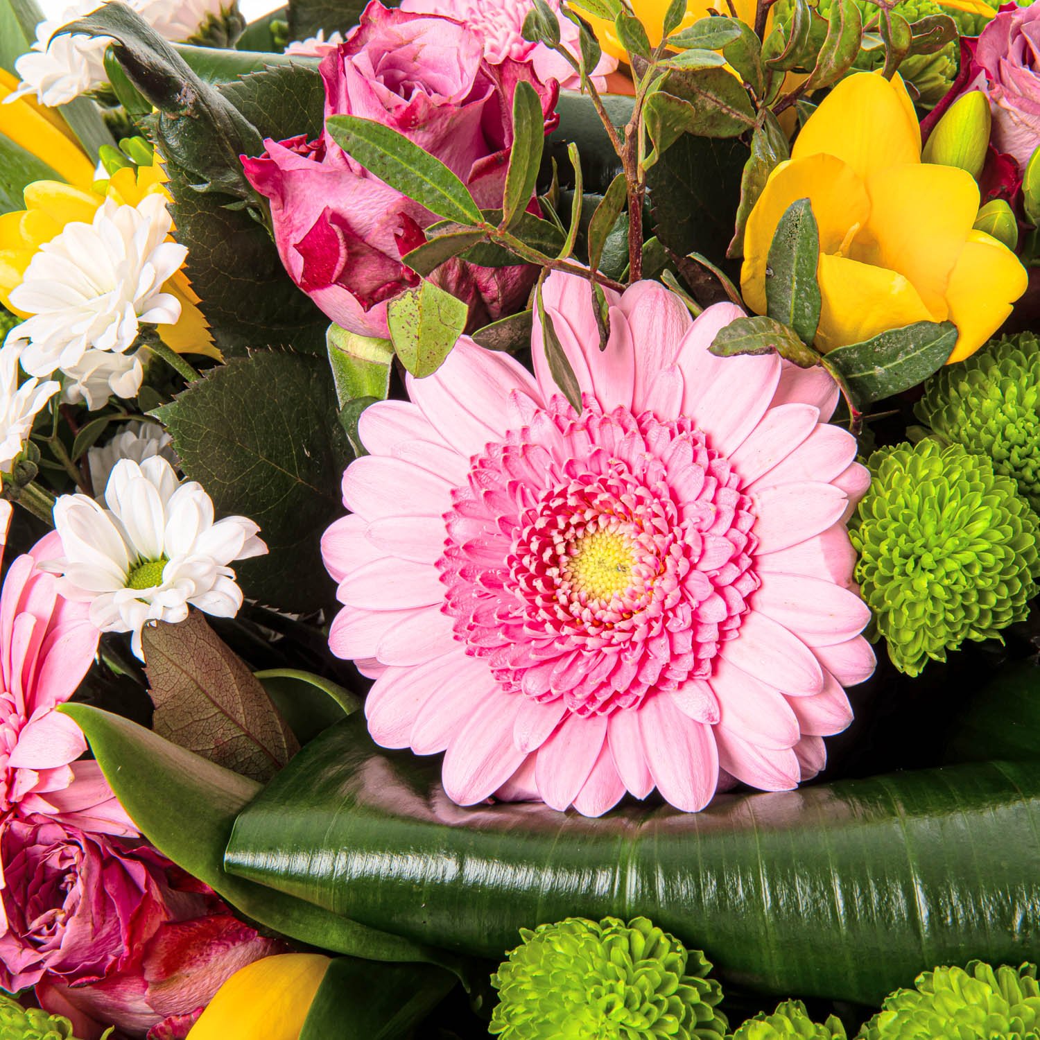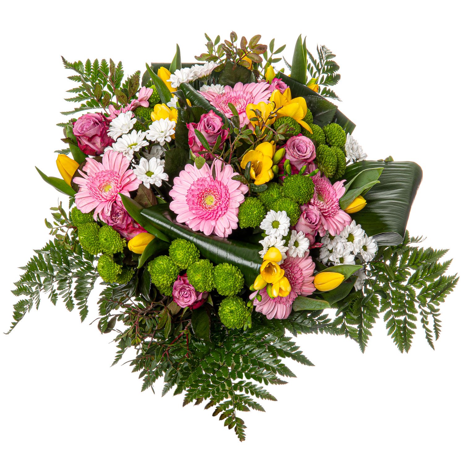 Tato pestrá kytice spojuje jemné odstíny růžových růží, mini gerber, bílých a zelených santini, žlutých tulipánů a elegantních frézií v harmonický celek. Doplněná o svěží dekorativní zeleň působí kytice radostně a svěže, navozuje pozitivní atmosféru a vnáší do každého prostoru letní energii. Dokonale se hodí pro gratulace, poděkování nebo jako překvapení pro blízkého člověka. Doručujeme ještě v den objednávky během pracovních dnů a můžete si rezervovat přesný čas doručení. Samozřejmostí je potvrzení o doručení e-mailem a nadstandardní péče zkušených floristek, které vždy dbají na profesionální uvázání každé kytice.