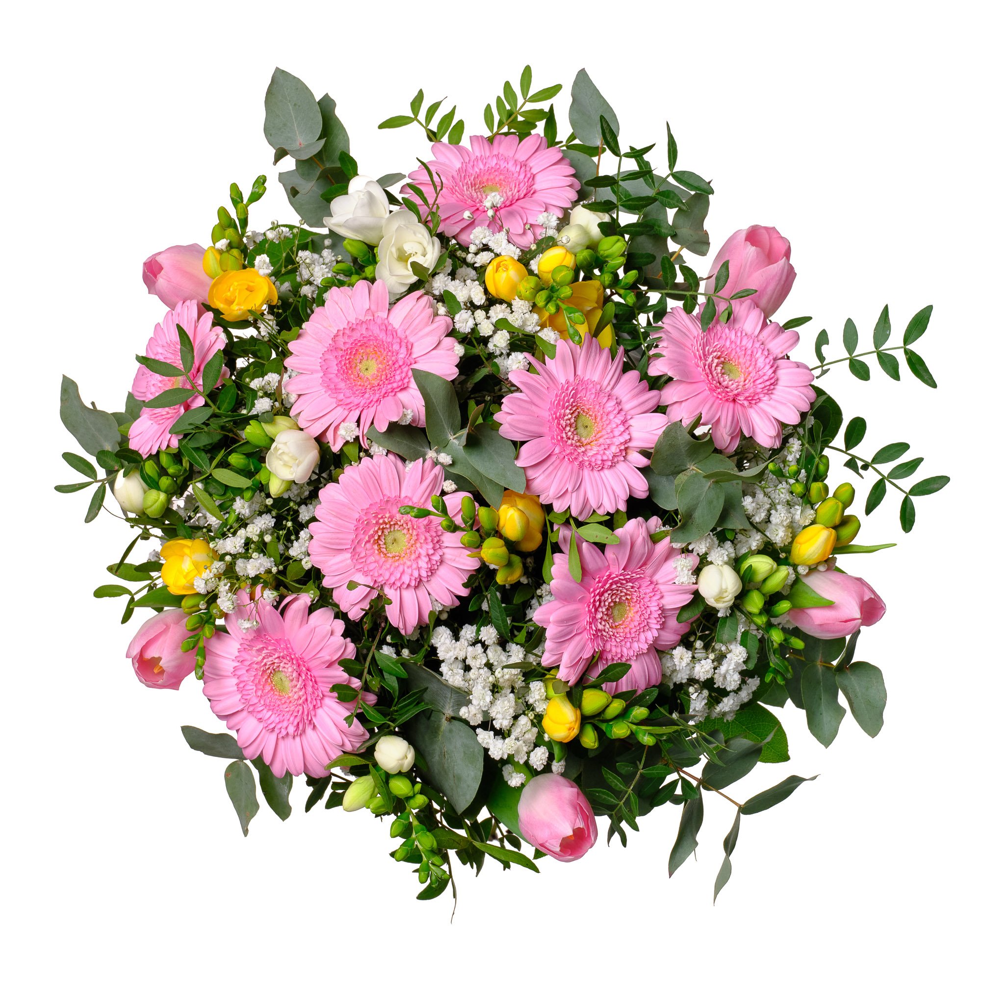 Kytice v jemných růžových, bílých a žlutých tónech tvoří harmonický celek, který působí svěže a radostně. Růžové mini gerbery vnášejí do aranžmá něhu, zatímco frézie přidávají vůni i jemný kontrast. Tulipány celé kompozici dodávají elegantní nádech a gypsophila vytváří dojem lehkosti. Doplněk v podobě eukalyptu a další zeleně nenápadně podtrhuje krásu každého květu. Tato kytice se skvěle hodí jako překvapení pro radost, k oslavě či jen tak pro zpříjemnění dne. Zajišťujeme doručení v den objednávky během pracovních dnů a poskytujeme potvrzení o doručení e-mailem. Vše předáváme s maximální vstřícností a péčí.